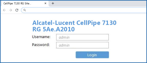 - The default username for your Alcatel-Lucent CellPipe 7130 RG 5Ae.A2010 is admin.