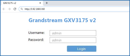 To get access to your Grandstream GXV3175 v2 ( also known as GXV3175 ), you need the IP of your device, the username and password. You'll find such information in the Manual of your Grandstream GXV3175 v2 router. But if you do not have the manual for your router or you do not want to read the whole manual to find the default login information then you can use the quick guide below. To get to the router login page it's necessary that you are connected to the router.