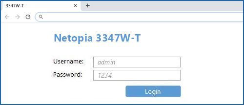 To get access to your Netopia 3347W-T, you need the IP of your device, the username and password. You'll find such information in the Manual of your Netopia 3347W-T router. But if you do not have the manual for your router or you do not want to read the whole manual to find the default login information then you can use the quick guide below. To get to the router login page it's necessary that you are connected to the router.