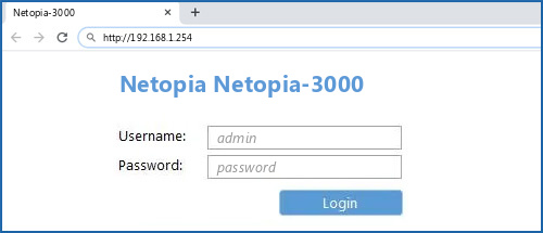 To get access to your Netopia Netopia-3000, you need the IP of your device, the username and password. You'll find such information in the Manual of your Netopia Netopia-3000 router. But if you do not have the manual for your router or you do not want to read the whole manual to find the default login information then you can use the quick guide below. To get to the router login page it's necessary that you are connected to the router.